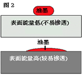 如果油墨的張力比物件大,油墨就不能貼服于物件表面。要改善此情況,物件需預(yù)先經(jīng)其他方法處理。所以要油墨有效地黏貼于物件上,油墨的張力必需比物件的表面能量低(圖2)。當(dāng)物件表面有油脂,塵埃或其他添加物等,均需預(yù)先清潔以確保最佳的上色效果。
